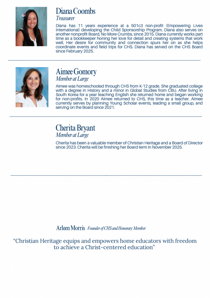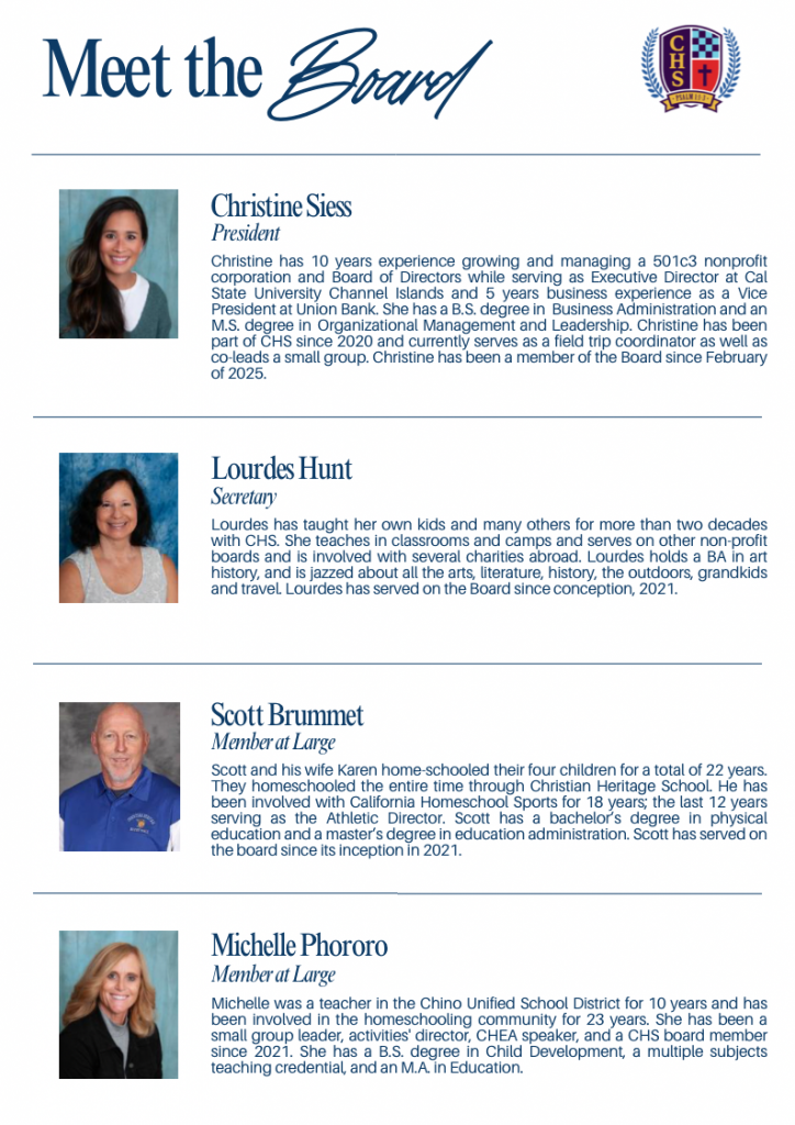 Christian Heritage School (CHS) is a Private school Satellite Program (PSP) that was established in 1991 to provide support, accountability, and guidance to home educators in the Inland Empire and nearby communities, including Orange County. Our focus is serving Christian families committed to teaching biblical values at home. We are guided by a Board of Directors under the business name of Christian Heritage School, Inc. We are a recognized public charity under the IRS code 501 (c) 3 statute.